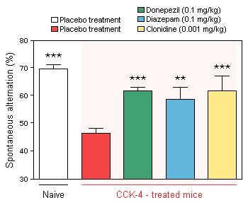 Crucially, pharmacological profiling revealed a selective signature. Diazepam and clonidine—both proven panicolytics—reversed the CCK-4–induced deficit, highlighting the involvement of stress-related mechanisms. Donepezil, a cognitive enhancer, also restored performance, underscoring the potential of cholinergic augmentation in anxiety-related cognitive dysfunction.