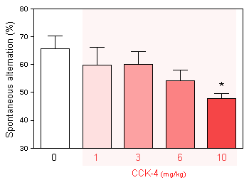 At Neurofit, we demonstrated that CCK-4 administration in mice induces a robust, dose-dependent reduction in spontaneous alternation in the T-maze, a hallmark of cognitive deficit. This effect was consistent and reproducible, validating CCK-4 as a reliable pharmacological model of anxiety-linked cognitive impairment.