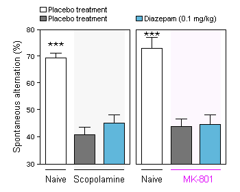 By contrast, diazepam failed to rescue scopolamine-induced deficits (amnesia model) or MK-801–induced deficits (psychosis model), confirming that the CCK-4 paradigm reflects a distinct, anxiety-driven cognitive pathology rather than memory loss or psychosis-related impairment. Together, these findings establish CCK-4–induced impairment as a clinically relevant preclinical paradigm for discovering therapies that can simultaneously reduce panic anxiety and restore cognitive control